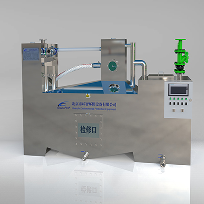 經固液分離的污水經導流管進入油水分離區,通過油輕水重的重力流原理,加之油水分離區的導流設計,氣浮裝置,控制油水在此區域的停留時間及增強油水分離速度。分離出來的油脂通過刮油裝置將油脂自動流入集油倉,經導油管排至集油桶內,為防止油脂凝固結塊,此區域設置有恒溫裝置。污水通過防虹吸出水管流至下端處理裝置或污水提升設備內。